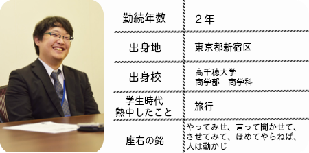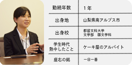「学べる会社。どんな小さなことでも教えてもらえる環境で、仕事だけでなく、人間関係も学ぶことができます。」