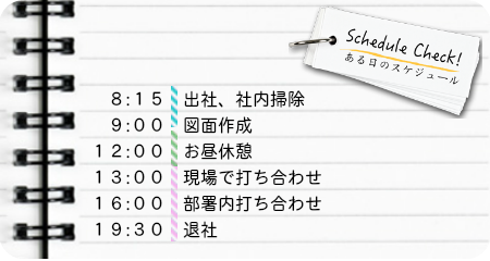 大学時代には、教養学部に所属していたという赤迫さん。「専攻は、建築とは無縁の言語学。学んだことはほとんど活かされていないかもしれませんが(笑)、言語のルーツを調べたり、対象をじっくり分析していく過程や、学ぶ姿勢は役立っていますね」と語ってくれました。さらに、専門分野以外から飛び込んだ経験から、「もし、最初に希望とは違う部署に配属され、そこで結果が出なかったとしても、その仕事がすべてではない。諦めずに頑張ってほしいですね」という言葉もいただきました。努力次第で、自分に合った職場に巡り合えることを教えてもらったような気がします。
