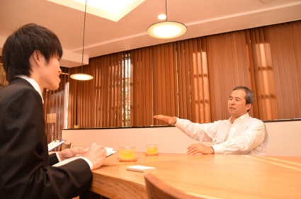 新築事業の注目ポイントは、なんといっても本物の天然無垢材。「お客様に本物のくつろぎ空間を提供したい」という有賀専務。早速、町田にある「鷲の家」ショールームを見学すると、木材の優しい香りと、滑らかな手ざわりの無垢材に感動!私も将来こんな家に住んでみたいと思いました。