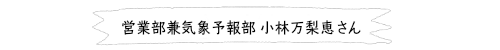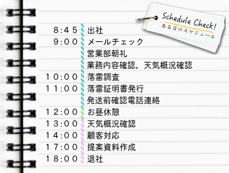 9時に出社し、午前中は落雷証明書を発行します。落雷証明書は、工場などで落雷により機械が故障してしまった時、保険請求をする際に必要となるものです。午後からは新規のお客様獲得に向け、提案書の作成をします。東海・四国地方の担当もしており、出張の日は朝からお客様を訪問します。 小林さんはプレゼンする際、その地域はどんな性格の人がいるのかまで調べることもあるそうです!天気以外のことも、しっかり分析するんですね。