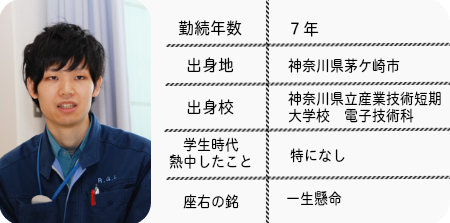 初めの頃は、稲場社長にも厳しい印象を持っていたそうです。業務上での関わりはないものの、技術者でもあった社長に業務のことで声を掛けられると冷や汗をかくことも…。しかし、社員1人1人に「頼むぞ、頑張れよ」と優しく声を掛ける姿も間近で見ていました。今は、「恵まれた環境の中で働けている」と感じているそうです。