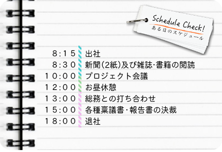 休日はテレビや映画鑑賞、読書をしているそうです。読書についてオススメを聞くと、「ヘーゲルの弁証法かな。“アウフヘーベン”。君も勉強してみたら?」と言われました。自分なりに調べてみると、哲学の分野で少し難しいのですが、『賛成意見と反対意見の本質を捉えて、考えを結合させることで新たな意見を生み出す』といった考え方なのかな…?と思いました。会社経営には哲学の知識も活かされていることが分かりました!