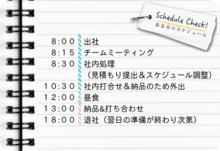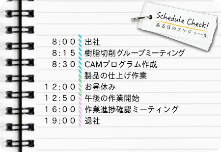 津田さんは営業課勤務で、色々な業界の研究開発部門へ訪問し、受注手配や製品の納品等をしています。豆生田さんは製造課勤務。お客様の思い描く新製品のイメージをCAMを使ってプログラミングし、樹脂切削などの技術で試作品というカタチにしていきます。プログラミングだけでも、複雑なものでは2日間かかることもあるとか。金曜日に、『月曜日までに仕上げてほしい』という要望をお客様から受ければ、残業や休日出勤もします。