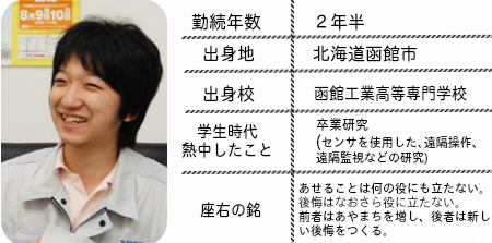 「やりたい仕事を思いっきりやらせてもらえるので、やり遂げた時の達成感は格別です。社内のフォロー体制も魅力ですね。そして、なんといってもレスコン! ロボットって、実は簡単に作れるんですよ(笑)。カメラやセンサーを付けてパソコンで遠隔操作してみると思い通りに動くんです。面白いので、たくさんの人に興味を持ってもらいたいですね。」