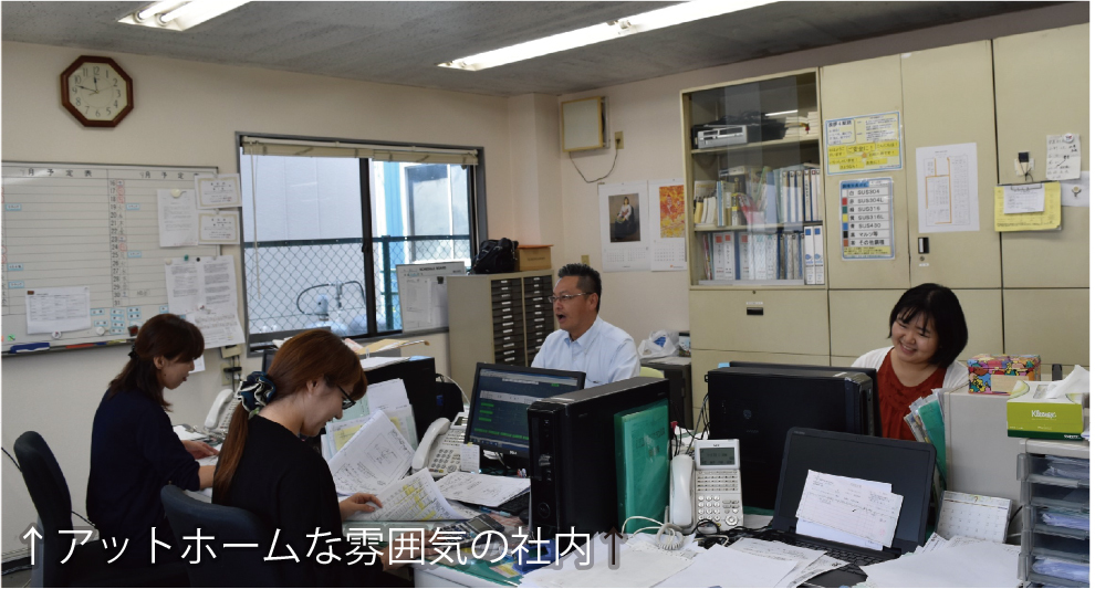 働いている社員については、若い方が多く、二十代三十代の方も多いです。また、南関東支店は女性が多く、「女性力」が大きな力となっています。全体は100名で、(男性)7:3(女性)の割合です。